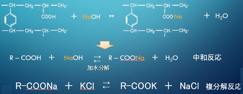 具体的には、スチレン–ジビニルベンゼン共重合体にスルホン酸基を導入すると強酸性陽イオン交換樹脂が得られます。また、同じ母体をクロロメチル化し、さらにアミノ化によって四級アミノ基を導入すると、強塩基性陰イオン交換樹脂となります。