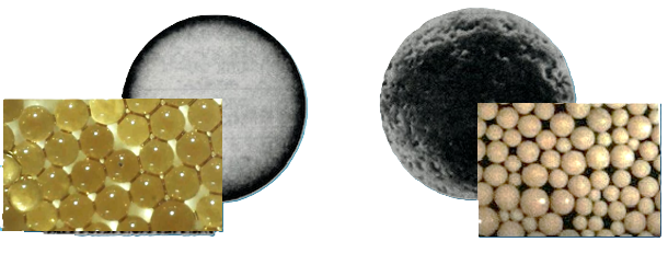 ゲル型は均一な三次元網目構造を持ち、狭小ミクロポアが主体、外観は透明〜半透明で、一般的に写真で目にすることの多いタイプです。一方、ポーラス型は樹脂内部にミクロポア以外にマクロポアやメソポアと呼ばれる1000Å程度の細孔を持つ構造を備えています。これにより、物質の出入りや有機分子の吸着挙動が異なります。