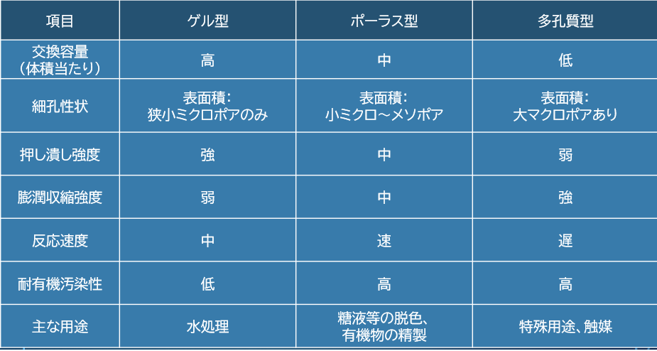 このように母体構造の違いによってイオン交換樹脂の特性は大きく異なるため、使用用途に応じて適切な母体構造を選択することが重要です。さらに、母体構造の違いによって強塩基性・弱塩基性あるいは強酸性・弱酸性の樹脂で市販されている製品ラインナップも異なりますので、実際にご使用中あるいはご検討中の樹脂の特性を把握する上で参考としてください。