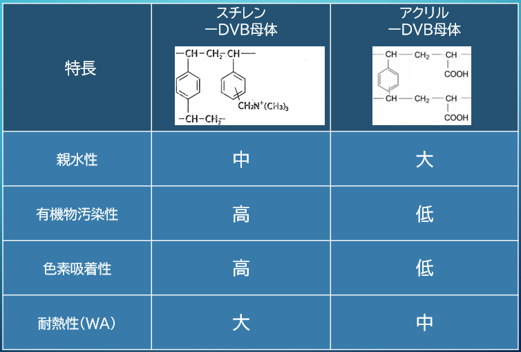 一般的に、市販されているイオン交換樹脂の主流はスチレン系の母体構造です。一方、アクリル酸エステル系やメタクリル酸エステル系の母体構造は、主に弱酸性陽イオン交換樹脂や弱塩基性陰イオン交換樹脂に利用されています。