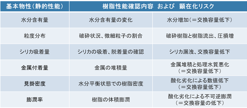 水分含有量、粒度分布、金属付着量、見掛密度、膨潤率なども重要な物性ではありますが、一般的な純水設備での劣化判断においては、次の項目が中心となります。