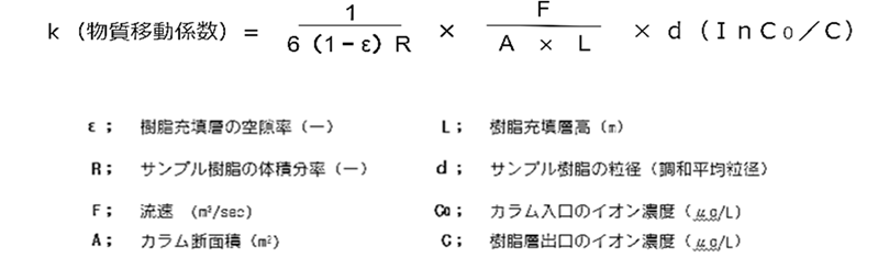 - 流速、入口・出口濃度、樹脂層高、粒径、空隙率などを反映